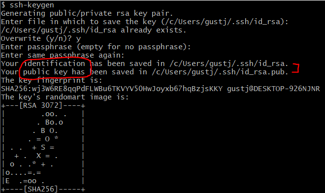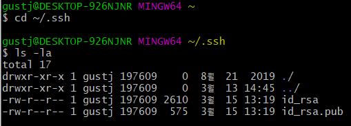 이후 엔터를 두번 입력하면 id_rsa(프라이빗 키), id_rsa.pub(퍼블릭 키)