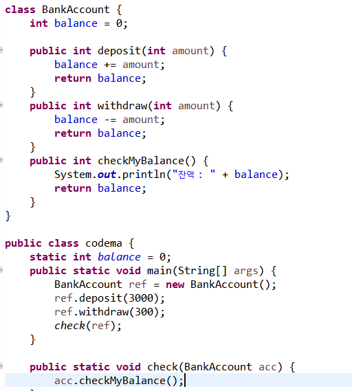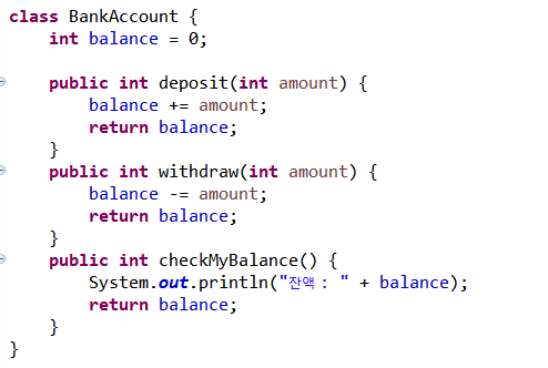 인스턴스 메소드 => public int deposit(int amount) ...