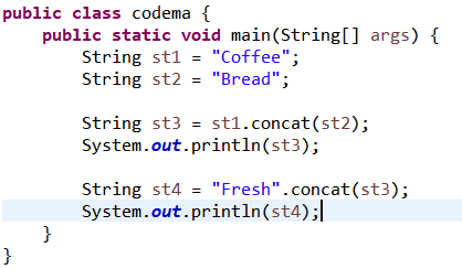 String 클래스의 다음 메소드를 이용하면 두 문자열을 연결시킨 문자열을 결과로 얻을 수 있다.
