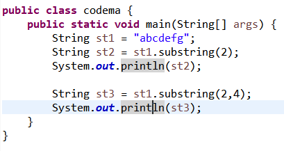 str.substring(2); //인덱스 2 이후의 내용으로 이뤄진 문자열 "cdefg" 반환