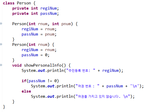 위의 Person 클래스에 정의된 두 생성자는 오버로딩 관계에 있다.