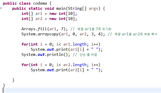 public static void fill(int[] a, int fromIndex, int toIndex, int val) -> 인덱스 범위까지 val 값으로 초기화
